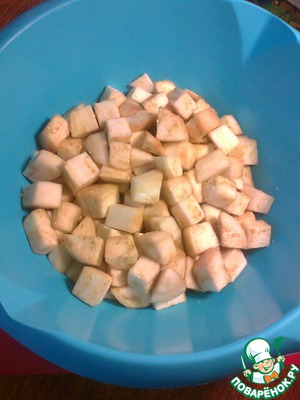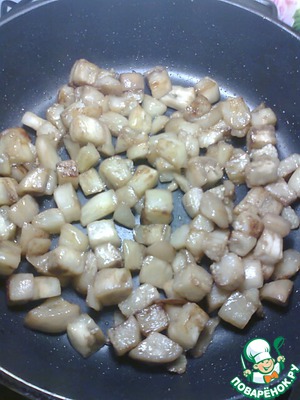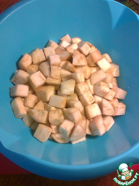 Баклажаны помыть, очистить от кожуры, нарезать кубиками (не очень мелко). Посолить и отставить на 30 мин., чтобы они отдали лишнюю жидкость с горечью.