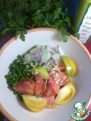 Помидоры нарезать крупно, лук - полукольцами, зелень мелко порубить (кто какую любит). Я кинзу не люблю, поэтому к зелени добавила кресс-салат, это только подчеркнуло вкус салата! Чеснок через пресс или мелко порезать.