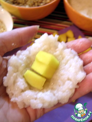 Берём небольшой шарик риса, расплющиваем, укладываем начинку и заворачиваем. Руки периодически можно смачивать водой.
