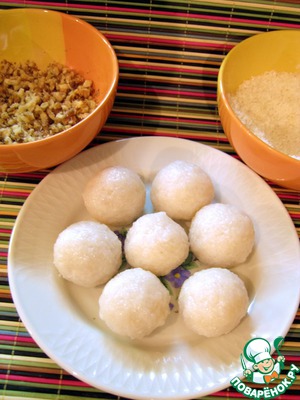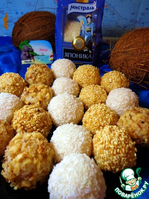 Обвалять наши "конфетки" в орехах, кунжуте, кокосовой стружке, что вам больше нравится. Готово!