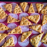 Тесто раскатать в круглый пласт толщиной 0,5-0,8 см и порезать на сегменты. -