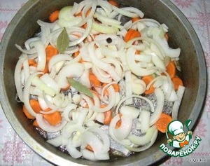 На морковь – лук, порезанный полукольцами. И добавляем перчики, гвоздичку, лаврушку. Соль по вкусу и немножко сахара. Приблизительно кофейную ложку без горки. Добавляем 150 гр растительного масла и доливаем водой, что бы погрузилась в жидкость рыба.