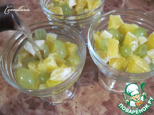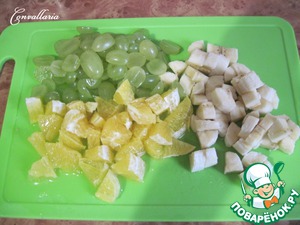 Банан и апельсины порезать кубиками, виноград – пополам.