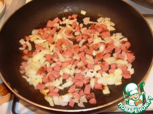 • Обжарить ветчину и лук на оливковом масле до румяности.