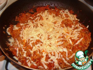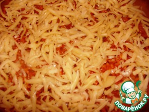 Полученную массу выложить в форму, засыпать оставшимся сыром и запечь до румяной корочки.