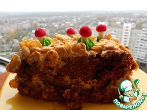 Утром перед подачей украсила "осенними листьями" - кукурузными хлопьями, важно, чтобы в ближайшее (в течение 4 - 5 часов) время тортик начали кушать, чтобы хлопья остались хрустящими. У меня были покупные сахарные грибочки, они завершили картину :)