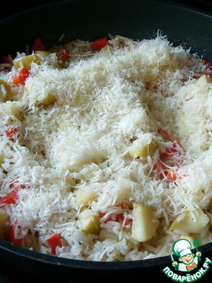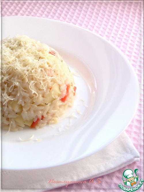 Выключаем огонь, подсаливаем ризотто и посыпаем тертым пармезаном (или другим твердым сыром). -