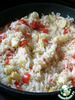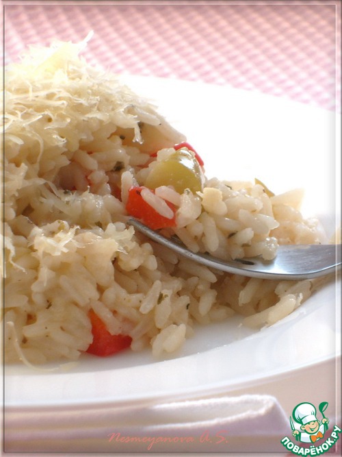 Мы привыкли, что по консистенции ризотто – кремообразное, более-менее густое, но не жидкое блюдо. Но стоит изменить один ингредиент, как всё меняется. При этом строго соблюдаются все технологические этапы приготовления ризотто. В итоге получаем новое прочтение традиционного итальянского блюда – рассыпчатый, но сочный рис с яркими вкусовыми вкраплениями болгарского перца, зеленого яблока и ароматного пармезана. Итак, фантазия на тему.