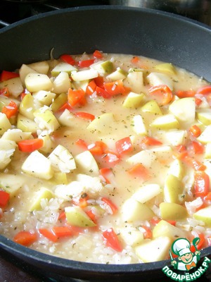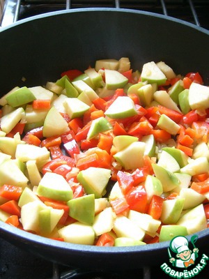 Лук пассеруем до прозрачности (не зажариваем!) с оливковым маслом на медленном огне. Добавляем болгарский перец и яблоки. Обжариваем пару минут на среднем огне.