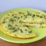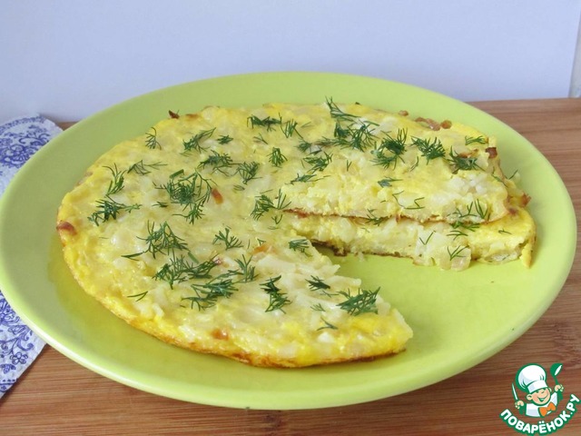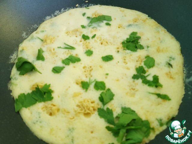 Получается что-то вроде запеканки с лапшой. Сверху посыпаем свежей зеленью.