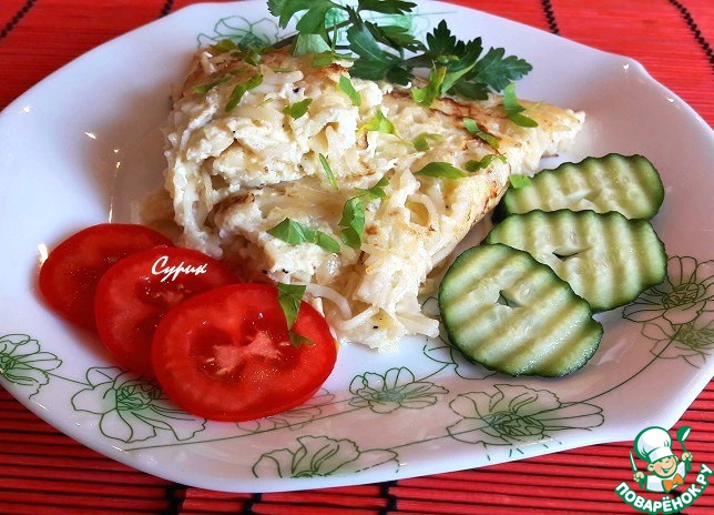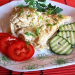 Пока жарится, взбиваем яйца с молоком, солим, в яично-молочную смесь высыпаем мелко поломанную лапшу.