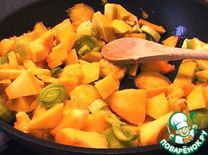 • Картошку, морковь и тыкву почистить, порезать на кусочки. Лук-порей порезать колечками и промыть, дать стечь. В сковородке растопить масло и обжарить овощи. Затем вкинуть в кипящий бульон. Варить мин. 15-20. Когда овощи станут мягкими, спюрировать, добавить соли, лимонный сок, чеснок. Взбить отдельно сливки и аккуратно ложкой вмешать в супчик.