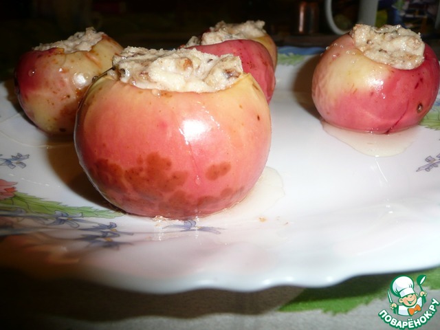 5) Смешиваем творог с сахаром, измельченными грецкими орехами, корицей и малиновым вареньем. Хорошо все перемешиваем и начиняем этой массой яблоки.