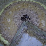 На безе выложить часть крема (не весь, оставить на бока) и накрыть вторым бисквитом. Растолочь песочное печенье (100 г) или, если Вы выравнивали бисквит, крошку бисквита соединить с остатками крема и этой массой обмазать бока торта, скрыть все дефекты.
