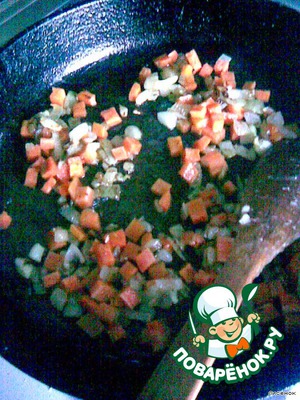 Морковь и лук нарезать маленькими кубиками и обжарить