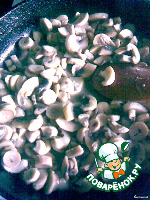 Шампиньоны порезать кусочками и обжарить. К грибам добавить измельченные помидоры ( без кожицы). Посолить и протушить 3 минуты.