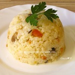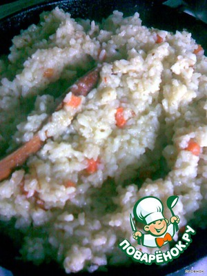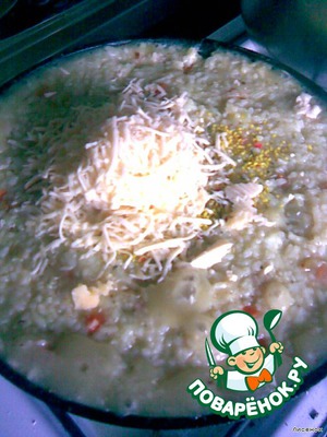 Сыр натереть на мелкой терке и вместе с куркумой, солью и перцем добавить к рису. Все перемешать и запечь в духовке 5 минут при t 180