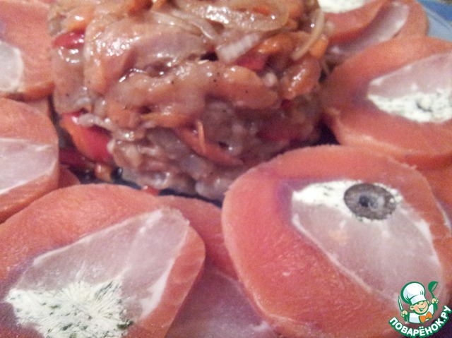 Через сутки рыбку очищаем от соли, вымачиваем примерно 30 минут в воде. Обсушиваем салфеткой. Посыпаем перцем. Укладываем тонкие пластинки ченока.