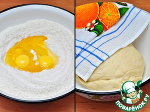 В чашку просеить муку, добавить соль, перемешать. Сделать в муке лунку, разбить туда 2 яйца, добавить растопленное топлёное масло, тёплую воду и замесить тесто. Тесто должно быть не липким.