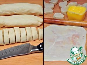 Разделить тесто на три одинаковых куска, раскатать их в "толстые колбаски", и каждую "колбаску" разделить на 10 равных частей. Итого у нас должно получиться 30 кусочков.