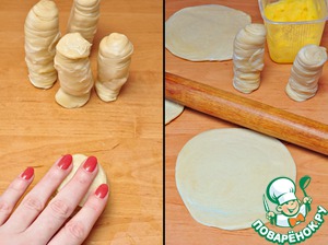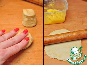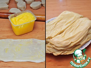 Положить на стол кусочек теста слоями вверх, прижать сверху ладонью, смазать с двух сторон маслом, раскатать диаметром в 10 см.