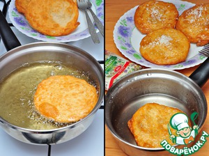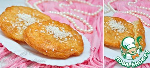 Полученные лепёшки обжарить во фритюре на растительном масле, затем, горячие лепёшки окунуть в холодный сироп, выложить их на тарелку и присыпать сразу кокосовой стружкой.