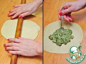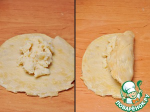 Положить на середину теста начинку, и сформировать пирожок, как показано на фотографии (накрываем начинку тестом с двух противоположных сторон, внахлёст).