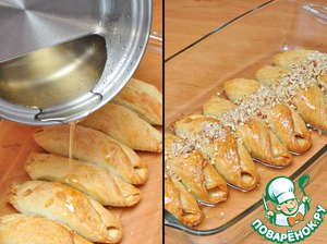 Горячие пирожки заливаем охлаждённым сиропом, и посыпаем сверху дроблённым миндалём. Дать им пропитаться сиропом минут 10-15, и всё, можно подавать.