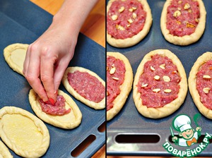 Заготовки теста положить на противень, смазанный маслом, или застеленный бумагой для выпечки, и на "лодочки" разложить сверху фарш. Поверх мяса посыпать кедровыми орешками, или какими другими дроблёнными орехами.