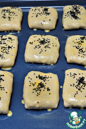 Самсу выложить на смазанный противень, или застеленный бумагой для выпечки, швом вниз. Смазать самсу взбитым яйцом, посыпать кунжутом, и запечь в нагретой духовке до 180 гр. Запекаем до румяной корочки.