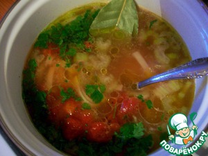 Добавить пасту и варить почти до готовности. За две минуты до полной готовности пасты добавить в суп помидоры, чили и рубленую зелень петрушки. Через две минуты выключить огонь и дать настояться минут 10.