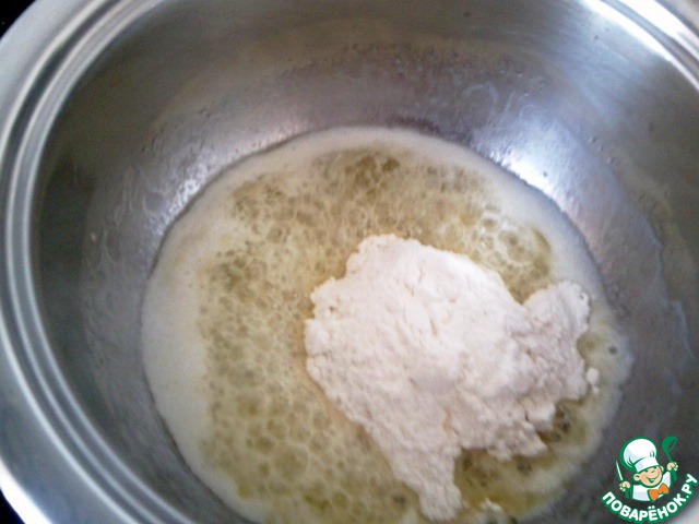 Приступим к соусу "Бешамель". Растопим сливочное масло в небольшой кастрюльке. Добавим муку.