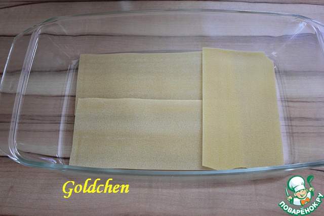 Берем огнеупорную форму и выкладываем первым слоем листья лазаньи,
