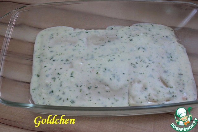 И хорошо размешаем венчиком. Даем мукe немного потомиться в маслице. Затем аккуратно, потихоньку добавляем молоко маленькими порциями. Иначе мука свернется, и у вас получатся просто комки. Этот соус надо на протяжение всей варки мешать, иначе он может пригореть. Вкус горелого потом останется, и вам придется выкинуть весь соус. Через минут 5 постоянного помешивания добавляем петрушку и соль. Выключаем соус и ставим в сторонку. Соус по консистенции должен получиться, как кисель, не гуще.