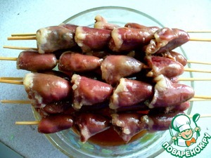 В этом маринаде маринуем около 4 ч. Сердечки, уже промаринованные, нанизать на деревянные шпажки.
