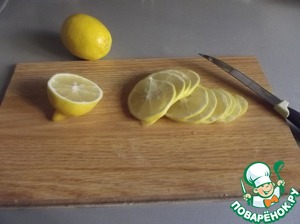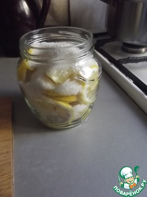 Лимон порезать колечками или полукольцами и поместить его в банку соответствующего размера.