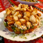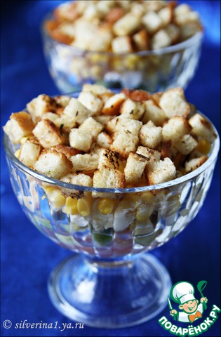 Салат выкладываем слоями: рыба, авокадо, кукуруза, сухарики.