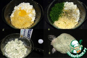 5. Пока можно сделать начинку. К творогу добавить тертый сыр (50 гр), желток, совсем немного соли.