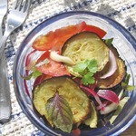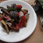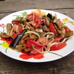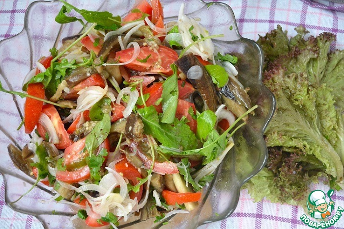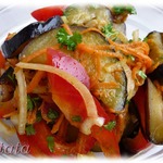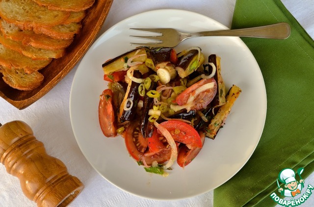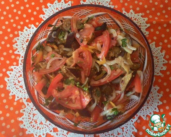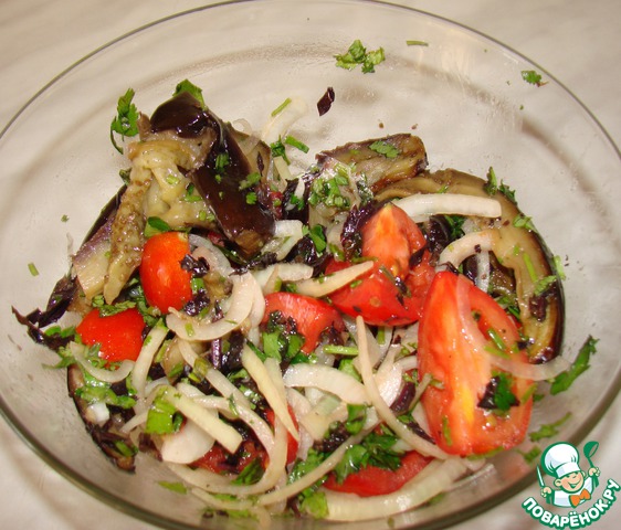 Этот салат из печеных баклажанов с помидорами и маринованным луком идеально подходит к шашлыку, отбивным и другим порционным блюдам из баранины или свинины. Как гарнир, так и закуска. Этот рецепт переняли у меня несколько шашлычных в нашем районе (это я так горжусь... Приятно же). Очень нравится мужчинам (моим в том числе).