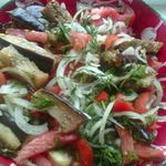 6. Теперь смешиваем в салатнице всё это счастье (баклажаны должны остыть). Масло не добавляем, достаточно будет промасленных баклажан. Лук из маринада отжимать не стараемся. Разбавленный уксус тоже играет не последнюю роль.