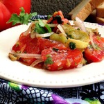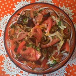 5. Режем помидоры на 4-6 частей дольками. Зелень крошим, как привыкли. Вообще-то для этого салата просто необходим фиолетовый реган. Баклажаны с ним очень дружат. Если вы не переносите вкуса/запаха кинзы и регана, просто добавьте ту зелень, которую любите (я даже базилик из горшка добавила).