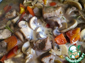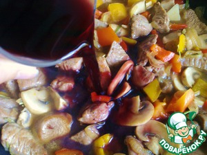 Верните в сковороду мясо, посолите, приправьте перцем и остатками розмарина по вкусу и влейте 150 мл вина, протушите под крышкой несколько минут. Затем рагу присыпьте 1-2 ч. л. муки (или загустителя соуса), перемешайте...