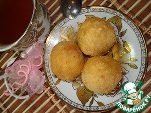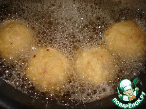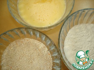 Каждый шарик поочередно обмакиваем в муке, далее во взбитых яйцах, затем очередь сухарей.