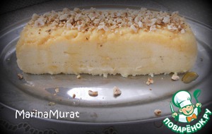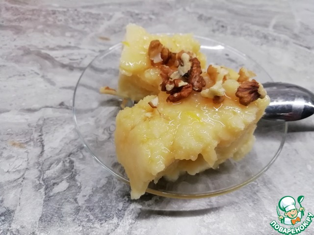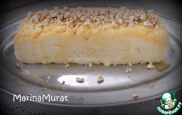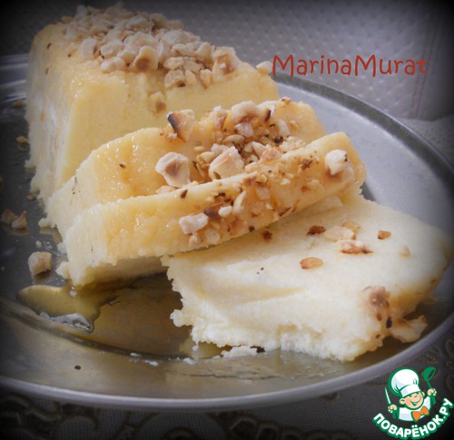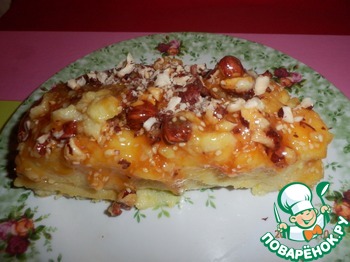 Готовый десерт режем на порции и подаем к столу. Чем больше орешков, тем вкуснее. Поэтому каждую порцию можно еще дополнительно посыпать молотыми орешками.