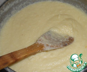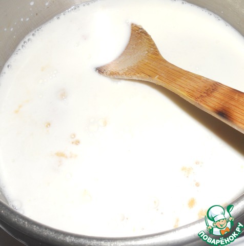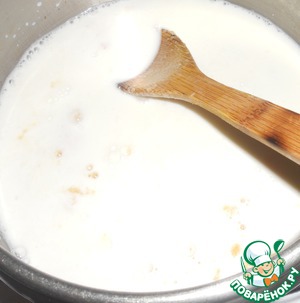 Тесто перекладываем в кастрюлю, наливаем молоко, помешивая.