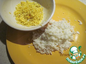 Отваренные яйца делим на белки и желтки и тоже мелко натираем.