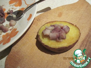 Теперь на кружочек обжаренного картофеля кладем около чайной ложки порезанной селедки с луком.