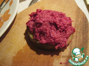 Сверху кладем около столовой ложки заправленной свеклы, формируем ложкой бугорок.