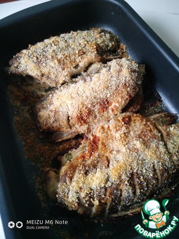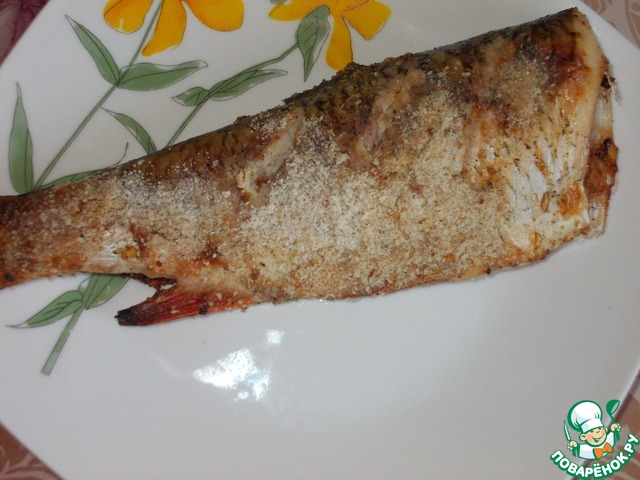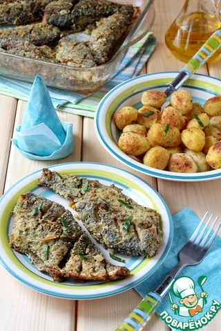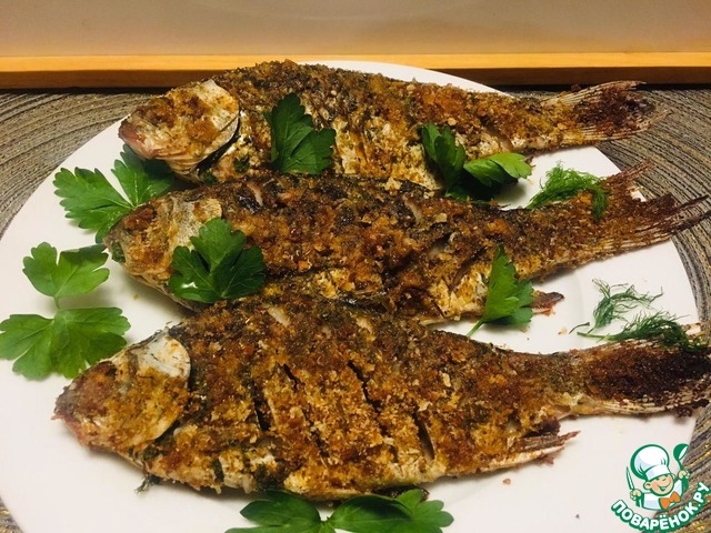 И петрушку, и укроп делим на четыре равные пучка. В каждую тушку кладем по такому пучку так, как есть (целиком). Присыпаем противень сухарями, укладываем нашу рыбку (сверху я тоже немного присыпала рыбу сухарями) и отправляем в разогретую духовку до 200С на 30-40 мин.
