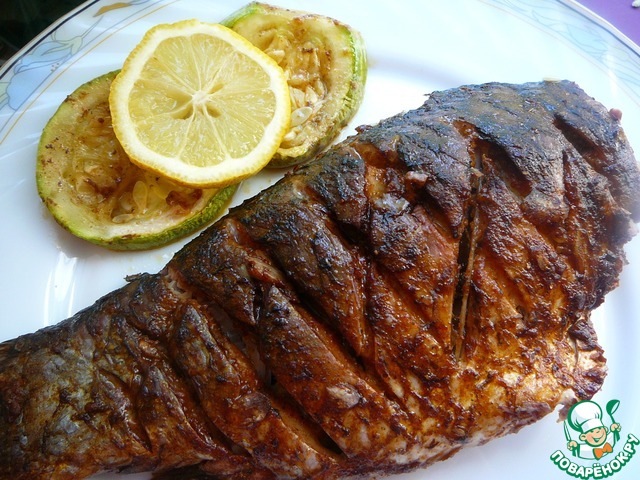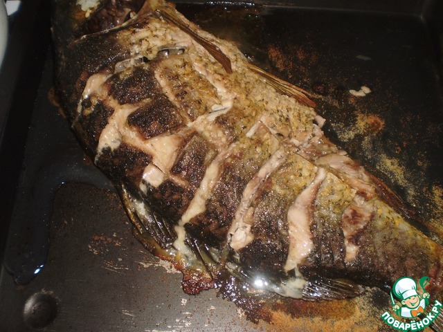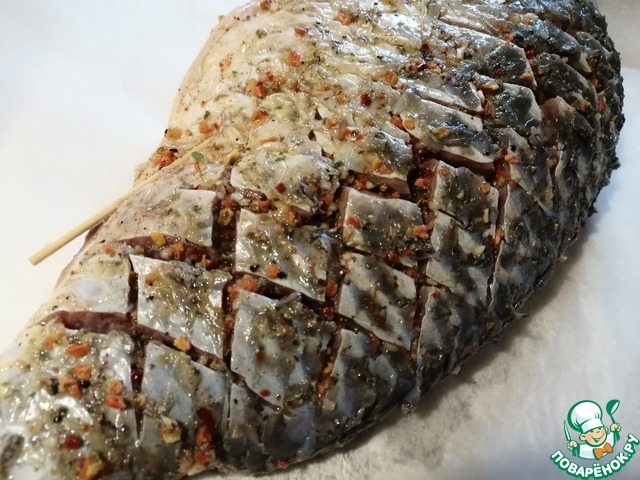 Рыбу перекладываем в миску, поливаем нашим маринадом (и сверху, и внутри) так, чтобы маринад попал в каждый надрез на рыбке, и отставляем на 1 час мариноваться.